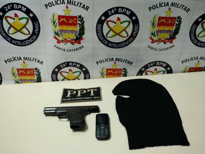 Os policiais fizeram uma revista dentro do carro e localizaram uma pistola calibre 9mm. Em posse do indivíduo foi encontrado um telefone celular e um toca bala clava. Diante dos fatos, o menor infrator foi apreendido e encaminhado para a Central de Plantão Policial de São José para providencias cabíveis.