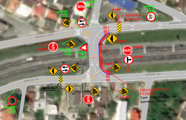 A Arteris Litoral Sul informa que foram implantadas mudanças operacionais no sistema viário do viaduto do Prado, localizado no km 192,4 da BR-101, em Biguaçu, nas proximidades da Rua João Rosa e da marginal norte da rodovia.