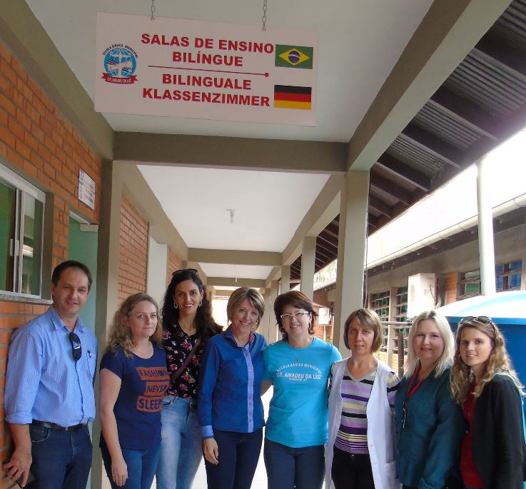 Egert conversou com a diretora da escola Amadeu da Luz, Karin Raduenz Hoeft, e com a coordenadora do ensino bilíngue, Ranice Dulce Trapp, que apresentaram o ambiente da instituição e as salas destinadas à prática.