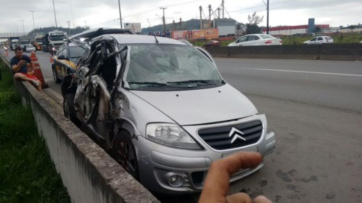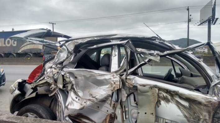 Um automóvel Citroën C3 ficou praticamente destruído, nesta quinta-feira à tarde, depois de ser prensado por um caminhão contra a mureta central da BR-101 – sentido sul -, no setor industrial de São José, próximo ao Shopping Continente. O motorista do veículo não ficou ferido.