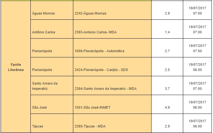 Em Antônio Carlos, segundo dados da Epagri/Ciram, os termômetros marcaram 1,4ºC às 7h desta quarta-feira. Em Florianópolis, a estação Carijós marcou 2,5ºC e a automática da Epagri 2,7ºC. Em São José, segundo o Inmet, o registro foi de 4,9ºC.