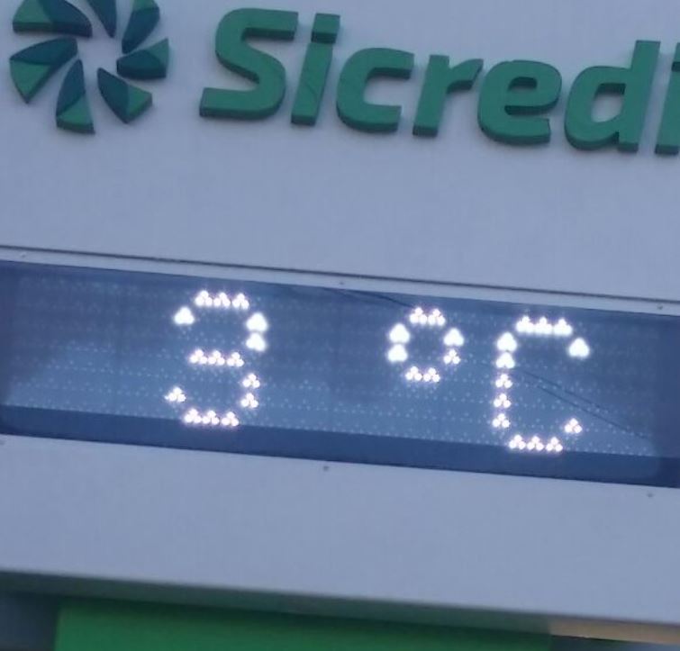 Eram 8h da manhã desta quarta-feira (19) quando o relógio do Sicredi na Praça Nereu Ramos, no centro de Biguaçu, apontava que a temperatura ambiente era de apenas 3ºC – a mais baixa do ano na cidade. No amanhecer do dia anterior, o registro fora de 6ºC.