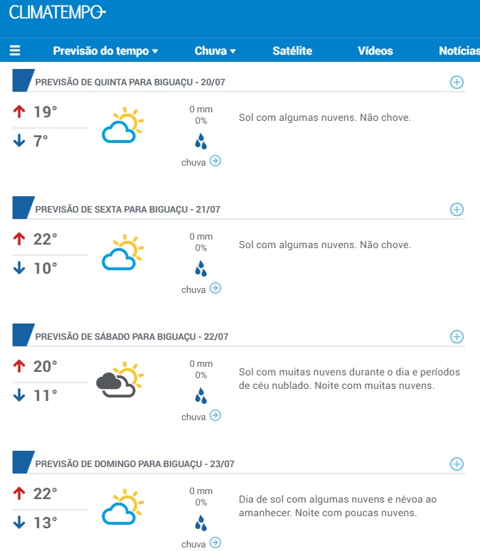 Previsão para o restante da semana em Biguaçu, conforme o Clima Tempo: