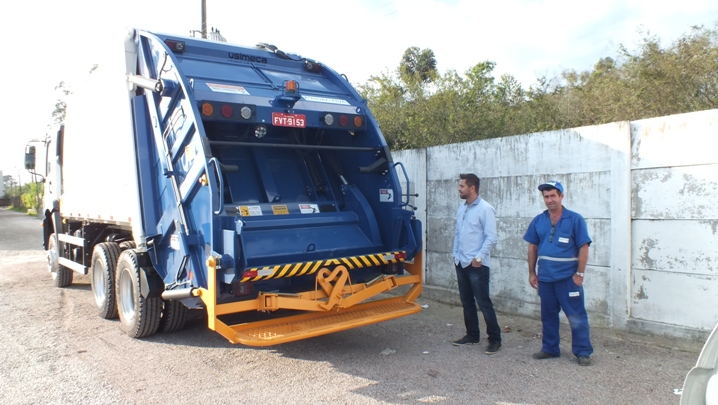 A coleta do lixo depositado nestes contêineres será efetuada por moderno caminhão coletor/compactador de resíduos sólidos. O caminhão, novo, já se encontra disponível para iniciar as operações.