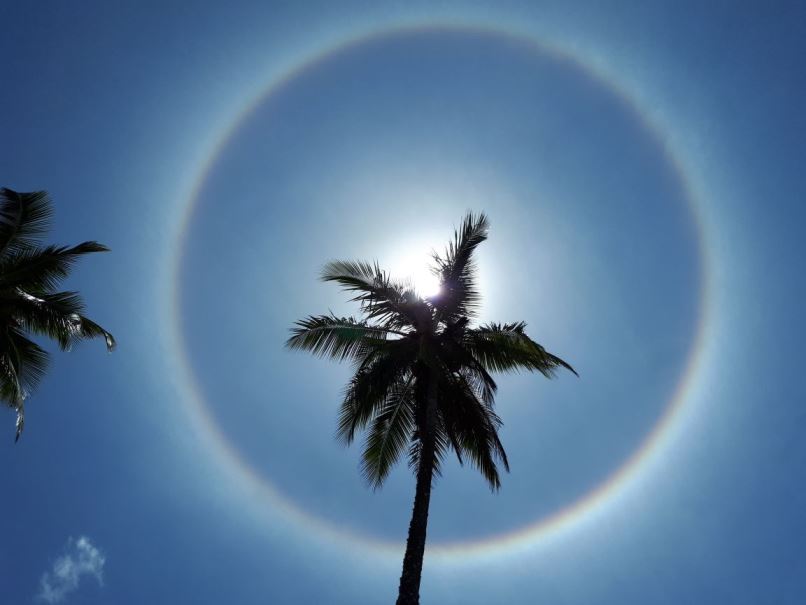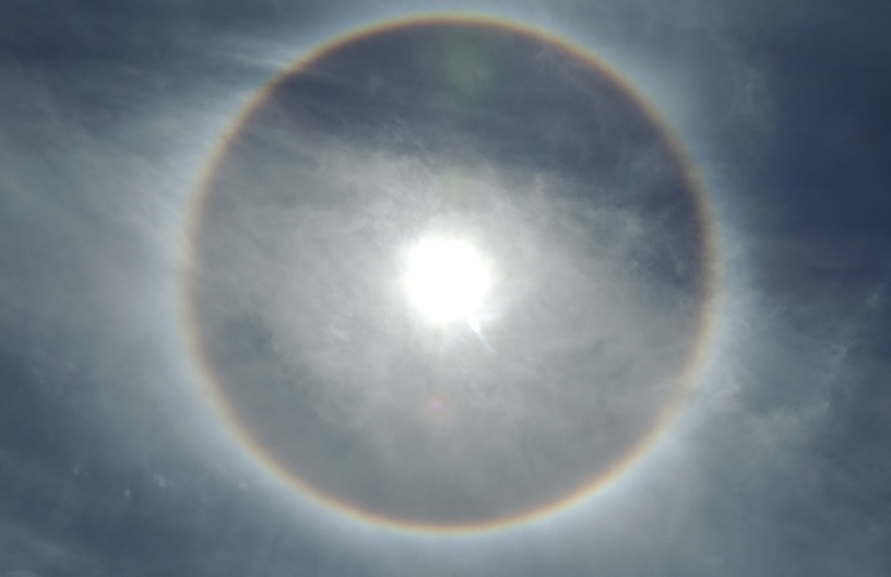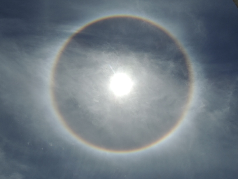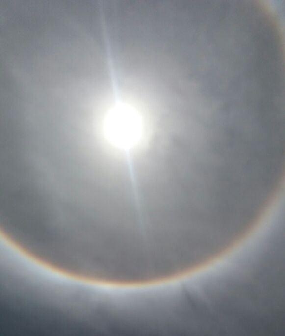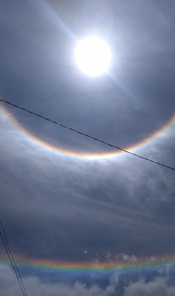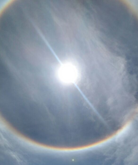 O céu da Grande Florianópolis foi contemplado, por volta das 12h desta segunda-feira (26), com um belíssimo fenômeno em torno do sol, um círculo colorido se formou em volta do astro-rei – acontecimento óptico conhecido como halo.