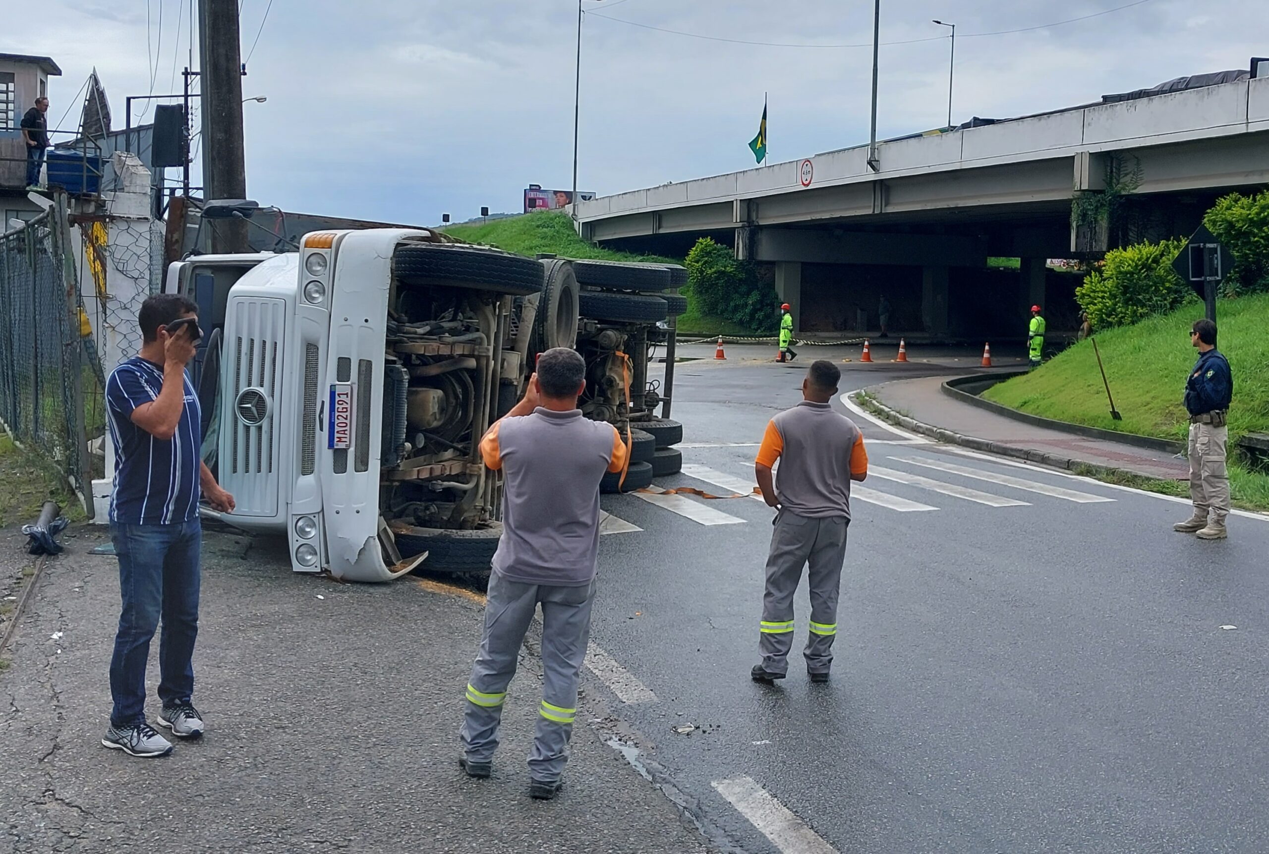 Um caminhão truck Mercedes Benz implementado com um caçambão tombou na marginal da BR-101, após passar por baixo do túnel da saída 195, que dá acesso ao centro de Biguaçu. O acidente ocorreu por volta das 8h e, até às 9h30, o veículo ainda não havia sido retirado do local. Não há informações sobre o estado de saúde do motorista.