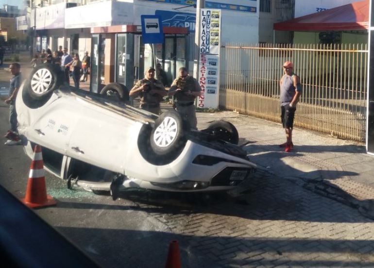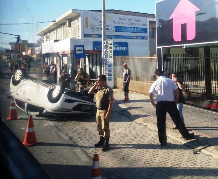 Um automóvel Hyundai HB20 com placas de Blumenau capotou, por volta das 6h desta sexta-feira (6), na avenida Leoberto Leal, no bairro Barreiros, em São José, nas proximidades da rua de acesso à faculdade Estácio de Sá. O motorista teve apenas escoriações. Um Fiat Uno também foi envolvido no acidente e teve parte da frente danificada. Ninguém ficou ferido.