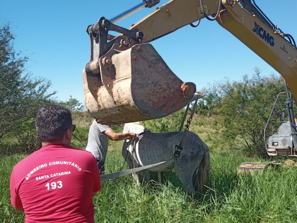 Um cavalo foi resgatado pela equipe do Corpo de Bombeiros de Biguaçu, após cair em uma vala, na manhã de quinta-feira (18).