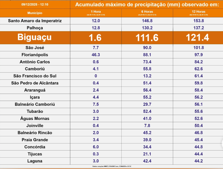 A Prefeitura de Biguaçu, por meio da Defesa Civil Municipal, informa que, nesta terça-feira (9), o município registrou 111,6 mm de chuva em aproximadamente cinco horas, colocando Biguaçu entre as três cidades de Santa Catarina com maior precipitação no período, ficando atrás apenas dos volumes que caíram em Santo Amaro da Imperatriz e Palhoça.