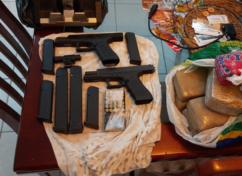 Em continuidade, foram presos outros dois homens em um apartamento em São José com o armamento de uso restrito que era utilizado para fazer a segurança do esquema criminoso, munições, cerca de cinco quilos de maconha, máquina de contar cédulas e outros objetos inerentes ao tráfico de drogas.