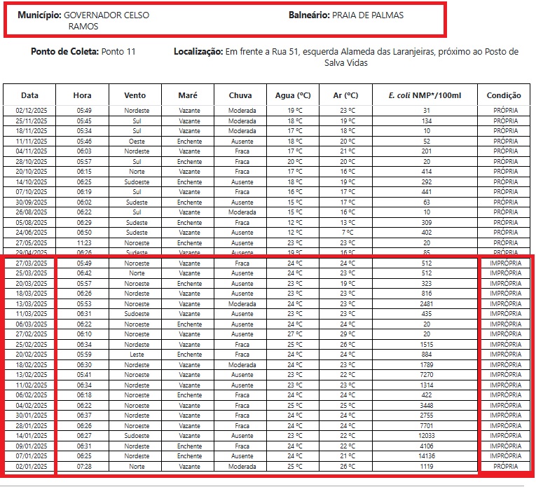 De acordo com publicação da prefeitura, uma equipe especializada atuará nos fins de semana para realizar uma fiscalização complementar dos sistemas de esgoto e saneamento, incluindo o funcionamento das Estações de Tratamento de Esgoto em prédios e residências da Praia de Palmas.