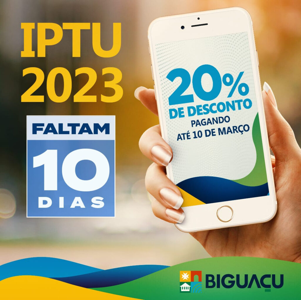 Os contribuintes de Biguaçu que pretendem ganhar 20% de desconto no pagamento do Imposto sobre a Propriedade Predial e Territorial Urbana (IPTU) têm 10 dias, a partir de hoje, 1º de março, para quitar o boleto em cota única. O vencimento será no próximo dia 10.