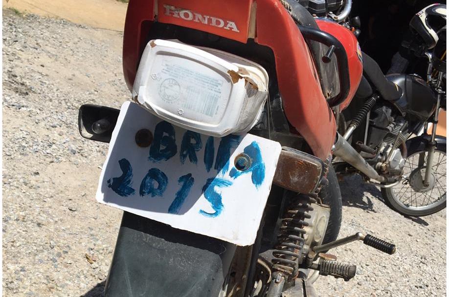 Ao avistar a dupla, a guarnição fez a abordagem e constatou que os dados não eram da moto, tão pouco foi possível identificar a motocicleta, pois a mesma estava com sua numeração suprimida.