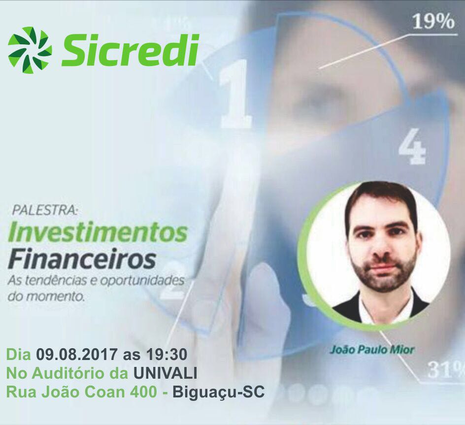 O assessor de negócios da Sicredi Aliança RS/SC João Paulo Mior ministra palestra gratuita, na noite desta quarta-feira (9), a partir das 19h30, no auditório da Univali de Biguaçu, abordando temas como investimentos, tendências, oportunidades e o atual cenário econômico do país. O evento é aberto ao público em geral.