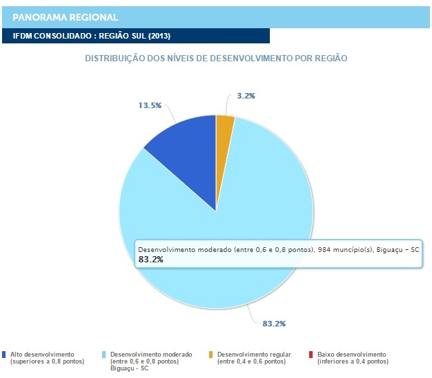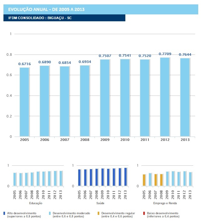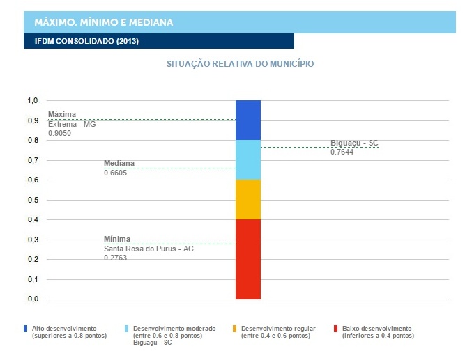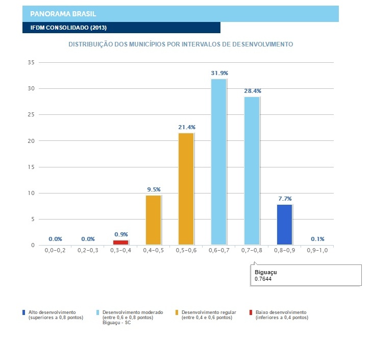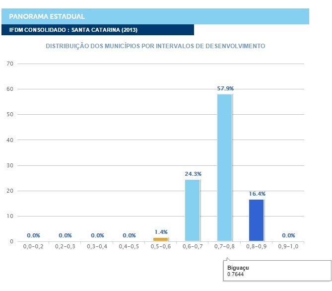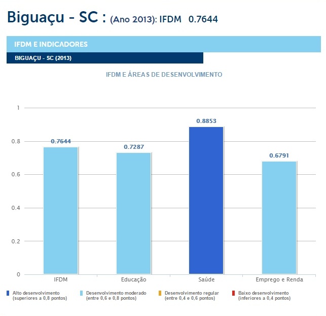 O levantamento mostra que Biguaçu está entre os 57,9% municípios catarinenses pontuados entre 0,7 e 0,8 no IFDM. Outros 16,4% estão na área dos que têm alto desenvolvimento, com IFDM entre 0,8 e 0,9. Uma parcela de 24,3% possui índice entre 0,6 e 0,7. Já 1,4% das cidades catarinenses estão com desenvolvimento regular, entre 0,4 e 0,6. Nenhum ficou abaixo de 0,4.