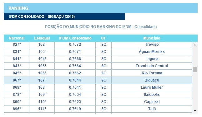 A edição 2015 do Índice Firjan de Desenvolvimento Municipal (IFDM), divulgado neste mês de dezembro (com dados do ano base 2013), indica que o desenvolvimento socioeconômico de Biguaçu é de 0,7644, que é considerado “desenvolvimento moderado“. Entre os 292 municípios de Santa Catarina, Biguaçu posiciona-se no 107º lugar. Para entrar no ‘rol’ das cidades com “alto desenvolvimento”, precisa atingir 0,8. O 1º município da lista é Concórdia (no Oeste), com 0,8933. Florianópolis é o 13º, com 0,8339; São José o 27º, com 0,8211 e, Palhoça, o 83º, com 0,7817.