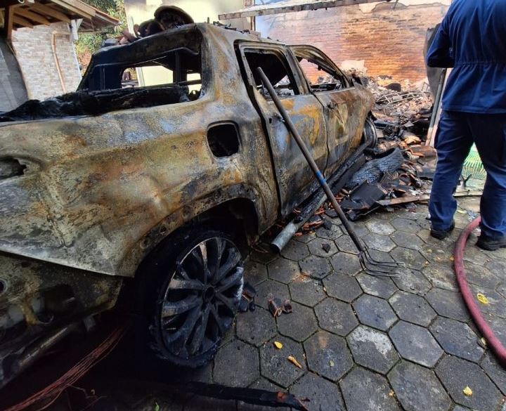 Um veículo Fiat Toro ficou totalmente queimado após um incêndio na garagem onde ele estava, no bairro Bom Viver, em Biguaçu. De acordo com informações do Corpor de Bomveiros, um botijão de gás de 5 kg que estava na garagem explodiu. Havia outro botijão de 13 kg na garatgem, mas este foi retirado a tempo.
