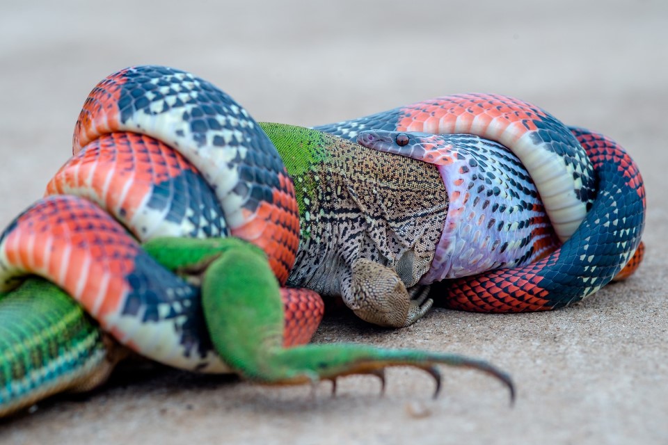 Uma cena pouco comum em ambiente urbano pôde ser vista em uma avenida de Bauru (SP). Uma cobra da espécie falsa coral engoliu um lagarto ameiva, também conhecido como lagarto verde, e chamou a atenção de quem passava perto do Sambódromo. Toda a cena foi captada pelas lentes do fotógrafo especialista em imagens de natureza Júnior Esteves, que registrou desde o momento em que a cobra imobilizou o lagarto – que acabou devorado inteiro, em cerca de uma hora e 30 minutos.