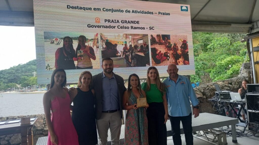 Representantes do comitê gestor do Programa Bandeira Azul em Governado Celso Ramos receberam oficialmente a Bandeira Azul Temporada 2022/2023 para a Praia Grande (Caravelas). A certificação foi entregue pelo Instituto Ambientes em Redes, que opera o Programa Bandeira Azul no Brasil, na Cerimônia Nacional Bandeira Azul que aconteceu nesta sexta-feira (11), em Niterói (RJ).