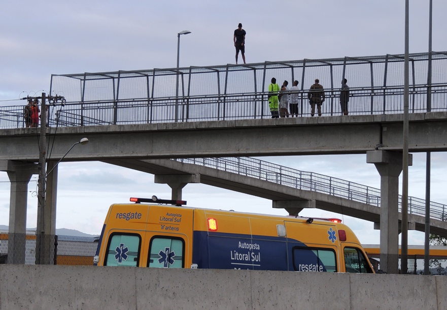 Um homem subiu na grade da passarela sobre a BR-101, na divisa de Biguaçu e São José, em frente ao Celeiros Beer, por volta das 19h, e por cerca de 50 minutos ameaçou se jogar de lá.
