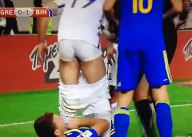 UOL – Quase no fim de partida entre Grécia e Bósnia, que terminou em 1 a 1, um lance esquentou o jogo e chamou muita atenção. Edin Dzeko não gostou da entrada do grego Sokratis Papastathopoulos e abaixou o calção do adversário, deixando o jogador grego de cueca em pleno gramado.