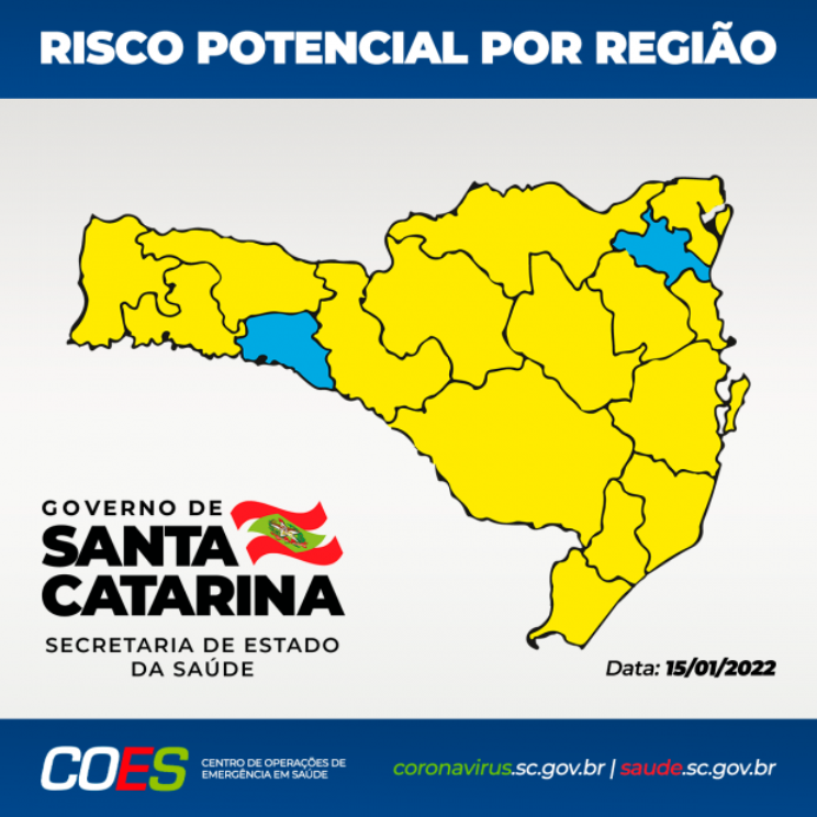 A Matriz de Risco Potencial Regionalizado divulgada no sábado (15), aponta 15 regiões classificadas como risco potencial alto (cor amarelo) e duas no nível moderado (cor azul). Em um comparativo com o relatório divulgado na semana anterior, as regiões do Vale do Itapocu e Alto Uruguai Catarinense se mantiveram no nível moderado e as regiões Grande Florianópolis e Carbonífera se mantiveram no alto. No entanto, houve piora nos indicadores das demais.