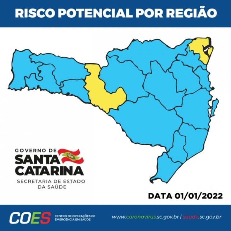 A Matriz de Risco Potencial Regionalizado, divulgada neste dia 1º de janeiro de 2022, aponta 15 regiões classificadas como risco potencial moderado (cor azul) e 2 regiões no nível de risco alto (cor amarelo). Comparando com o relatório divulgado há 15 dias, houve piora nos indicadores da região Nordeste e Meio Oeste, que tiveram pioras nos índices. As demais regiões permaneceram estabilizadas.