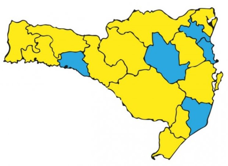A matriz de risco potencial regionalizado, divulgada neste sábado, 05, aponta cinco regiões classificadas no nível moderado (cor azul): Alto Uruguai Catarinense, Alto Vale do Itajaí, Foz do Rio Itajaí, Laguna e Vale do Itapocu, e 12 regiões foram classificadas como nível alto (cor amarela): Alto Vale do Rio do Peixe, Carbonífera, Extremo Oeste, Extremo Sul Catarinense, Grande Florianópolis, Médio Vale do Itajaí, Meio Oeste, Nordeste, Oeste, Planalto Norte, Serra Catarinense e Xanxerê.