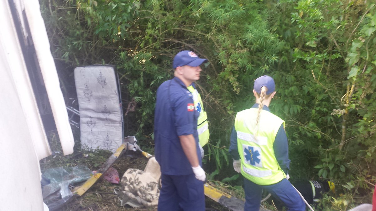 De acordo com a Polícia Rodoviária Federal (PRF), o ônibus é da banda gaúcha G10. O motorista não teria conseguido contornar a curva e o veículo acabou tombando.