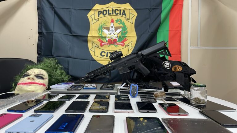 No local, os policiais civis apreenderam 22 celulares, quatro tablets, dois notebooks, uma máquina de cartão, além de uma réplica de um fuzil, modelo AR 15 (arma de airsoft), uma capa de colete tático e uma máscara de borracha com a imagem do personagem Coringa, possivelmente utilizada nos crimes para intimidar vítimas.