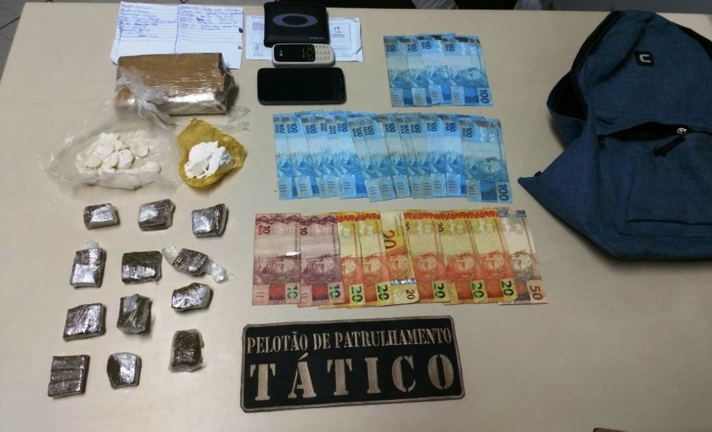 Na tentativa de fugir da polícia, um deles deixou cair uma mochila jeans contendo um tablete pesando 500 gramas de maconha, 12 tabletes de maconha prontos para a venda pesando 200 gramas, 42 gramas de cocaína pura, 31 gramas de escama (entorpecente utilizado para fazer crack), dois aparelhos celulares, um caderno de anotações contendo informações da contabilidade do tráfico, R$ 1.990 em espécie, e uma carteira contendo documentos.