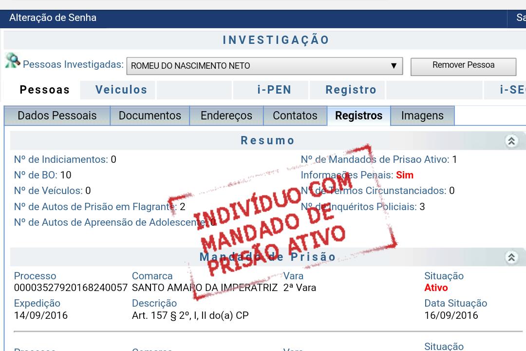 O boletim de ocorrência foi registrado e a PM constatou que Romeu do Nascimento Neto estava com mandado de prisão em aberto expedido pela 2ª Vara Criminal de Santo Amaro da Imperatriz, pelo crime de roubo à mão armada. Ele tem dez passagens pela polícia por crimes diversos e já foi preso em flagrante duas vezes.