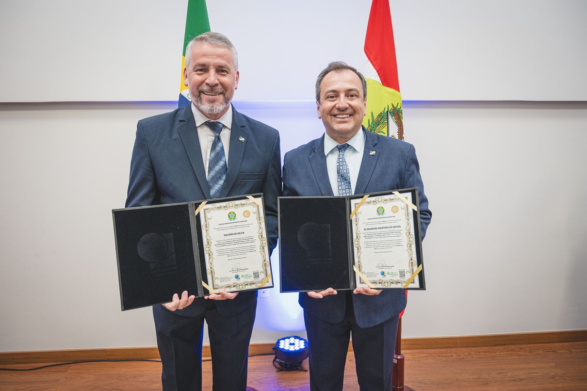 O prefeito Salmir da Silva e o vice-prefeito Alexandre Martins de Souza, ambos reeleitos no dia 6 de outubro para administrar Biguaçu entre 2025 e 2028, foram diplomados pela Justiça Eleitoral em cerimônia realizada na segunda-feira (16), no auditório do prédio da Prefeitura Municipal. Na oportunidade, os 15 vereadores que irão compor a próxima legislatura também foram contemplados.