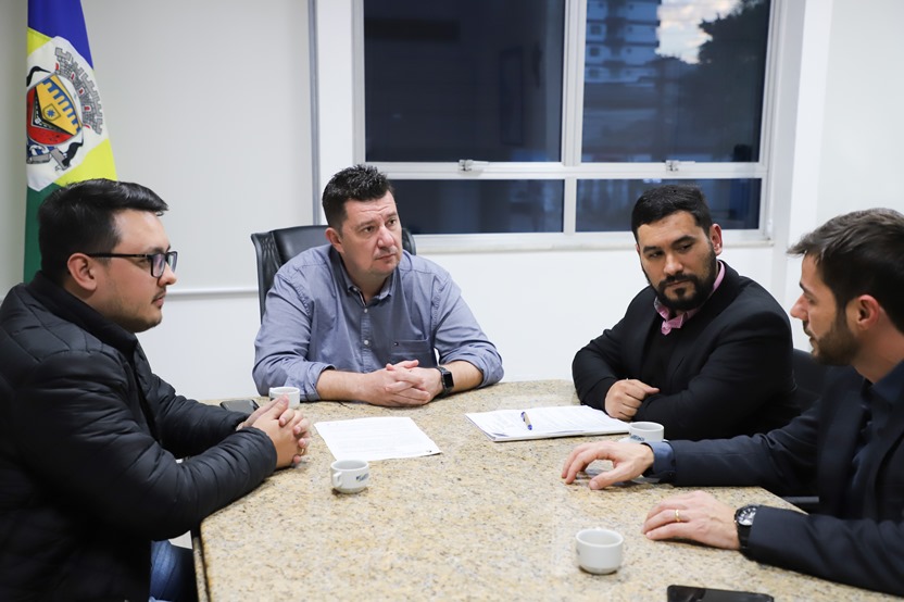 O prefeito Ramon Wollinger (PSD) e o secretário da Receita, Bruno Marques, receberam o diretor financeiro da Casan, Ivan Gabriel Coutinho, e o assessor da presidência da companhia, Marcell Karam, para a assinatura do documento.