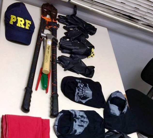As viaturas da PRF iniciaram a perseguição e conseguiram interceptar os ladrões cerca de sete quilômetros à frente, no sentido Norte. Dentro do Focus foram localizadas luvas pretas, toucas balaclava, alicate de grande porte (para corte de correntes, cadeados dentre outros), torquesa, martelos e óculos transparente, que são objetos comumente utilizados na prática de arrombamentos e furtos. Também havia roupas diversas com etiquetas de lojas, provenientes de furto realizado no município do Sul do Estado, várias etiquetas soltas de roupas e dinheiro de origem desconhecida.