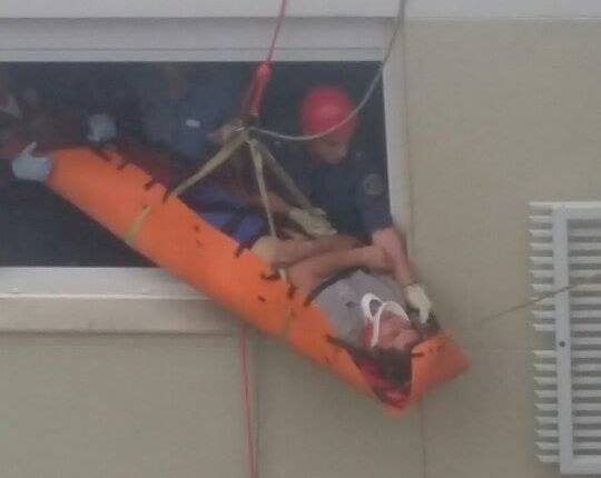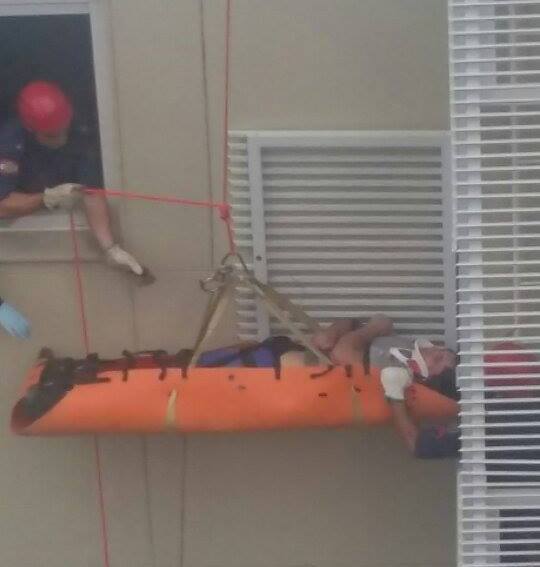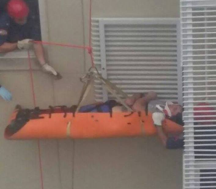 Com um rapel da cobertura do prédio, no 14º andar, os socorristas desceram até a plataforma onde o trabalhador estava. Lá, ele recebeu os primeiros atendimentos e foi colocado em uma maca. Em seguida, foi levado até uma janela do 10º andar, de onde foi levado para dentro de um dos apartamentos.