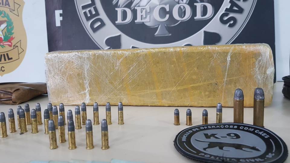 Durante as diligências, foram localizados pelo cão farejador Darth, no interior do armário de roupas do quarto do homem, cerca de 1 kg de maconha e 27 munições de calibres variados. Diante do estado de flagrância em que se encontrava o investigado, ele foi conduzido até a DECOD/PCSC para a lavratura dos procedimentos legais.